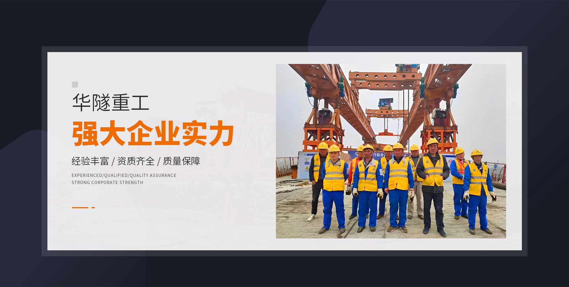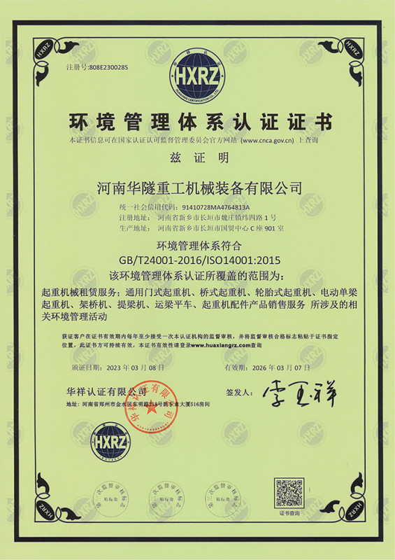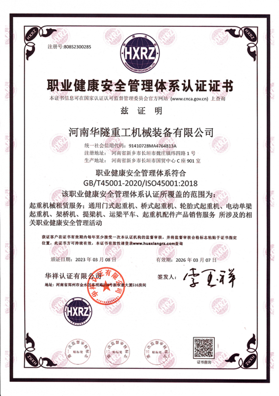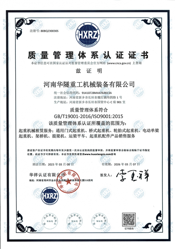 河南華隧重工機(jī)械裝備有限公司主要從事通用門式起重機(jī)、橋式起重機(jī)、電動單梁起重機(jī),輪胎式起重機(jī)、架橋機(jī)、提梁機(jī)、遠(yuǎn)梁平車、鋼絲繩電動萌蘆、卷揚(yáng)機(jī)、起重配件制造、銷售:起重機(jī)械租賃、安裝和維修,起重設(shè)備園收,機(jī)械設(shè)備維修,鋼結(jié)構(gòu)工程承包,橋梁工程及技術(shù)咨淘服務(wù),銷售五金制品、機(jī)電設(shè)備:建設(shè)工程監(jiān)理,建設(shè)工程設(shè)計,各類工程建設(shè)活動,建筑勞務(wù)分包,建筑物折除作業(yè),施工作業(yè),工程管理服務(wù),土石方工程施工,裝如發(fā)運(yùn)。  公司已通過IS0國際質(zhì)量、環(huán)境、健康與安全三合一標(biāo)準(zhǔn)認(rèn)證,特種設(shè)備制造許可證和特種設(shè)備安裝改造維修許可證。擁有完熟的質(zhì)量管理體系。嚴(yán)格的管理制度,強(qiáng)大的生產(chǎn)能力和先進(jìn)的檢測手段,在保證產(chǎn)品質(zhì)量的同時,也具備了極強(qiáng)的市場競爭力。  公司堅持科技創(chuàng)新為理念,產(chǎn)品質(zhì)量為核心,注重信譽(yù),建立了減信可靠、快捷、思速。便利周到的售后服務(wù)網(wǎng)絡(luò)。  我們擁有的技術(shù)專家和技術(shù)服務(wù)隊伍為客戶提供充善的售前技術(shù)支持和全天候的售后服務(wù)體系,讓您無后顧之憂,享受一站式的超值服務(wù)。  “華隧重工,伴您成功“是華隧重工永遠(yuǎn)的宗指,真被的希望與各界朋友攜手并進(jìn)。共創(chuàng)輝準(zhǔn)!